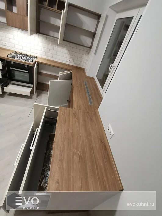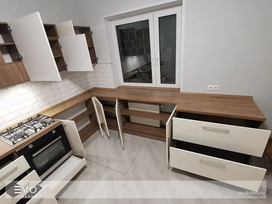 •Особенности: изготовление не стандарта по глубине и ширине столов и верхних полок, столешница переходящая в подоконник, скрытый радиатор в нижнем столе под окном
